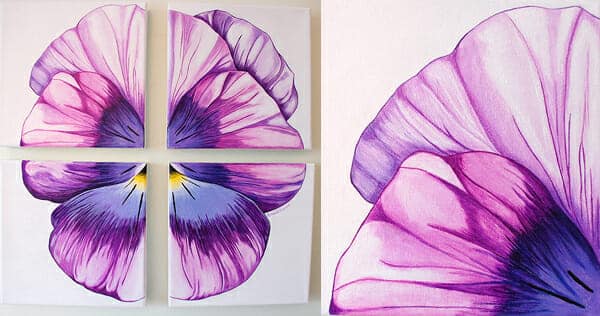 While the snow was falling outside, I spent most of the weekend working on this commissioned piece, which is of a purple “Pansy.” This painting is another four-piece painting, similar to “Lion Sun.”