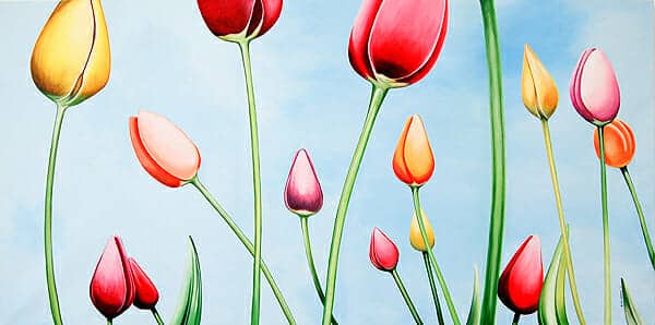 I love recharging my batteries by laying on a blanket on the grass and just gaze up at the sky. With this piece (and the smaller one before it) I imaginede what it would be to lay on one of those tulip fields in Holland in Spring time and experience the color burst in person. Or if you have lots of tulips planted in the yard that you can look through while seeing some distant airplane flying up high above or following where a bird is flying.  It’s the time to reconnect with the Earth and just relax, and forget about the yard work that you never got to… Let these colorful buds take you away.