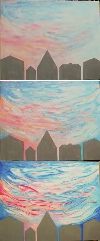When I started, I had in mind this very airy, light and romantic sunset-ish skyline and have now managed to turn it into a dark and heavy looking piece, which is probably part of the problem. Is it working? I think it does, it’s just not what I had in mind… It just kinda happened. So now i’m not sure what the finished piece is suppose to look like. I’ve done 9 layers and i’m starting to lose my patience.. I need an end in sight!