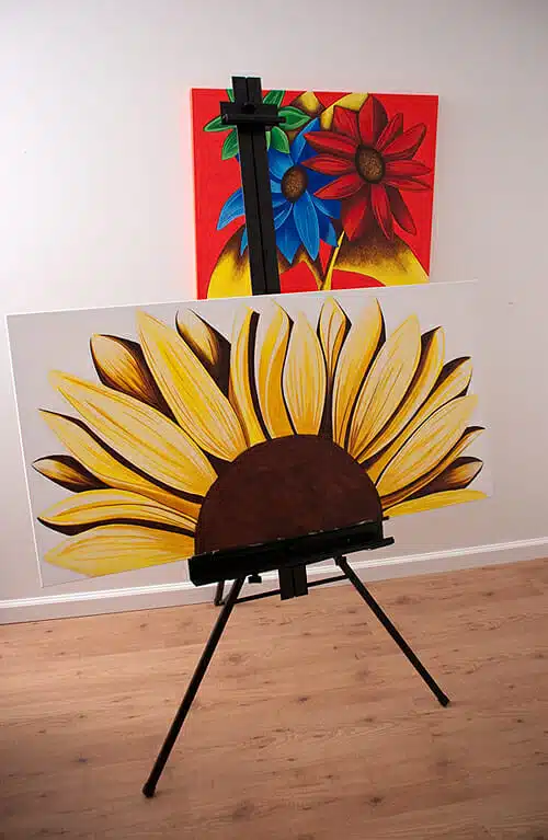 Here’s the painting I’m currently working on. It’s a commissioned two piece sunflower. The easel can handle both canvases (total 48×48 inches), but I’m still early in the process so working on them one at a time is fine for me. You can also see an already finished commissioned piece in the background, “French Kitchen No.2.” It’s getting packed up and shipped to Richmond today! Official photos are coming in a couple of days.
