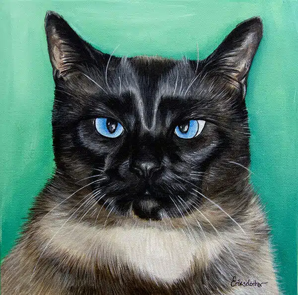 Mr. Kitty Kat is a dark seal point siamese (and yes, he’s slightly cross eyed! too cute!) and the client wanted him to “pop” against the background – as much as Frisky does with his white fur against the aqua green background. She trusted my instincts and wanted to be surprised so I only sent a photo of the painting once it was finished.
