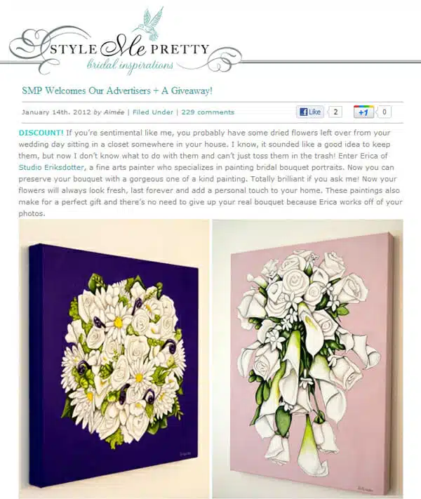 Who doesn’t love Style Me Pretty?! If you’ve planned a wedding or been in one recently, you know this is the ultimate wedding blog and the go-to resource for the modern bride. They recently gave my bridal bouquet paintings rave reviews in this lovely write up (part of the advertising package I’m currently doing with them). It came out last month and included an offer I want to extend to you!