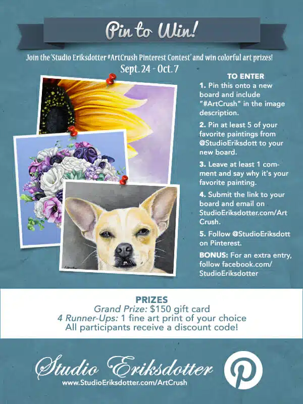To enter, create a new board that includes the above contest image, and pin 5 of your favorite paintings from @StudioEriksdott on Pinterest. Leave at least 1 comment on a painting sharing why it is your favorite. Don’t forget to follow @StudioEriksdott and to submit your board link and email address below. This way I can contact the winners and send out the discount code. If you want to up the odds of winning, follow facebook.com/StudioEriksdotter for an extra entry into the contest. Be sure to let me know when you submit your information below.